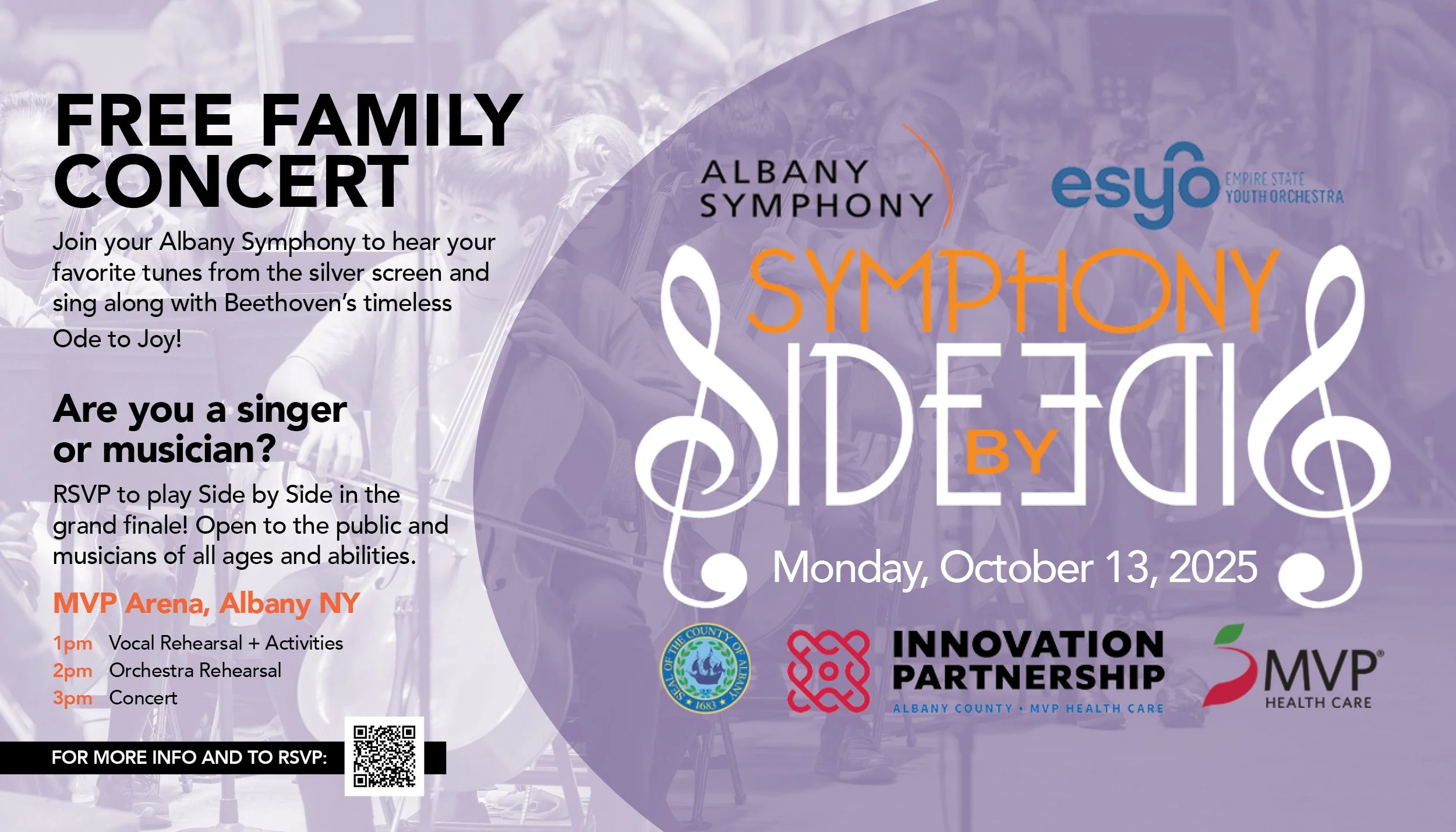 ALBANY, NY – The GRAMMY Award-Winning Albany Symphony and the Empire State Youth Orchestra (ESYO) will present “Symphony Side by Side,” a Pops Concert and day of collaborative music-making, on October 13, 2025 from 1:00pm to 4:30pm at the MVP Arena, thanks to the Innovation Partnership of the Albany County Executive and MVP Health Care. This special event invites student and amateur musicians – and now, this year, singers too! -- of all levels to perform with the Albany Symphony and ESYO. Together, the groups will rehearse and perform a free family-friendly concert for the community, gaining invaluable insight into the professional symphonic process.