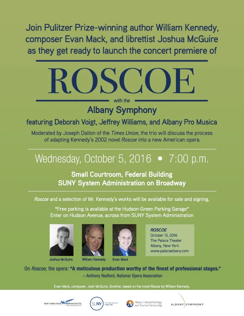 In advance of this one-of-a-kind event, on October 5, the opera's composer and librettist, Evan Mack and Joshua McGuire, will be joined by Mr. Kennedy at SUNY Plaza in Downtown Albany to discuss the process of adapting the novel for the stage. Roscoe, published in 2002, in one of Kennedy's critically acclaimed "Albany Cycle" novels, and the thick of the action takes place in the heart of downtown in the 1930s and 1940s.