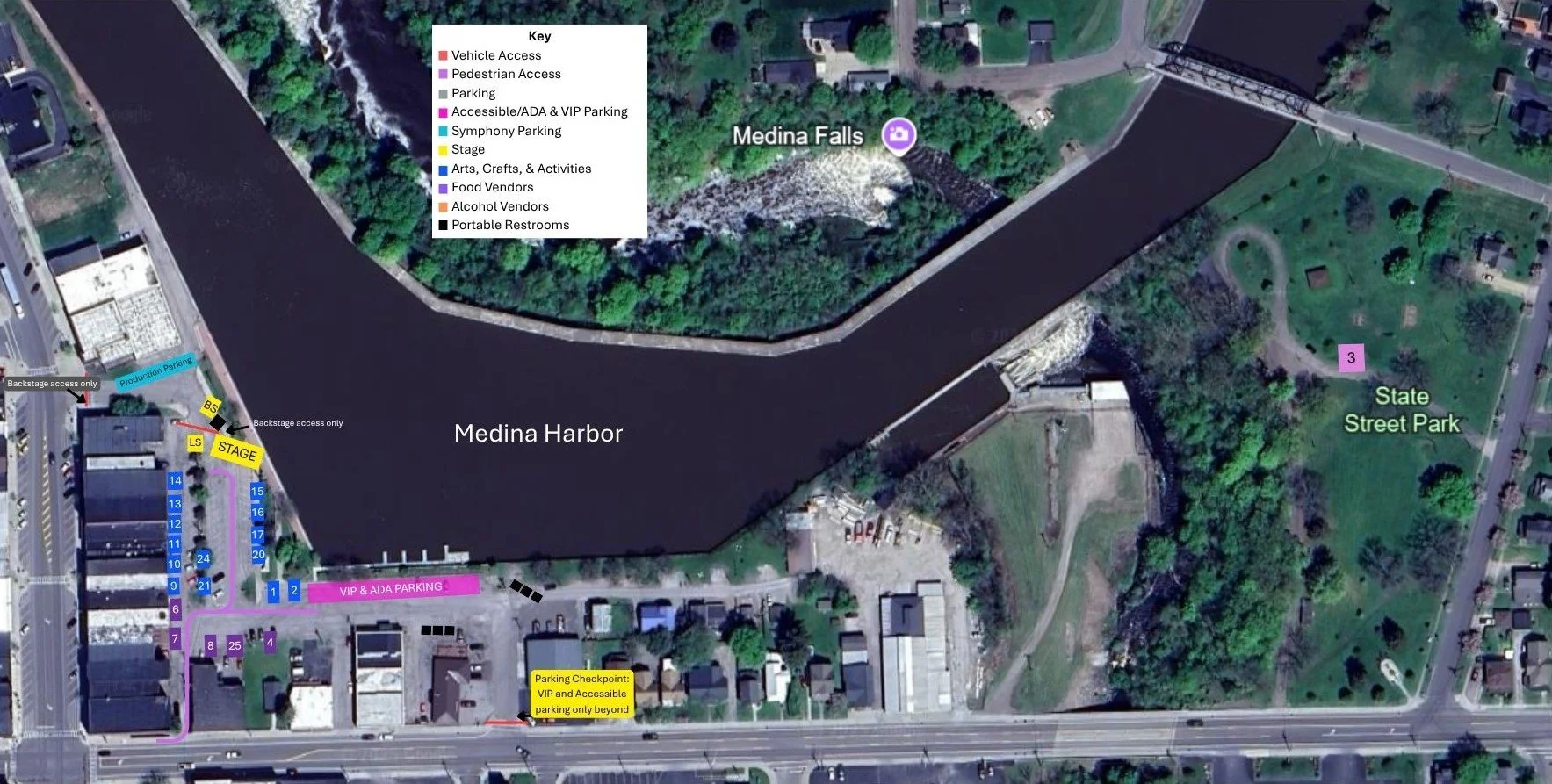 The Medina Canal Port, AKA the "Canal Basin", is a wide turning area of the Erie Canal featuring a marina with boat slips, pump out station, water, electric service and comfort station with showers. Picnic tables, a gazebo and car-top boat launch are on-site with ample parking. Take a leisurely hike along the towpath east to the Medina Falls & Aqueduct where the Oak Orchard River passes below the canal. Cruise Nights, featuring classic/vintage cars and 60s music, are celebrated Fridays during the summer months.